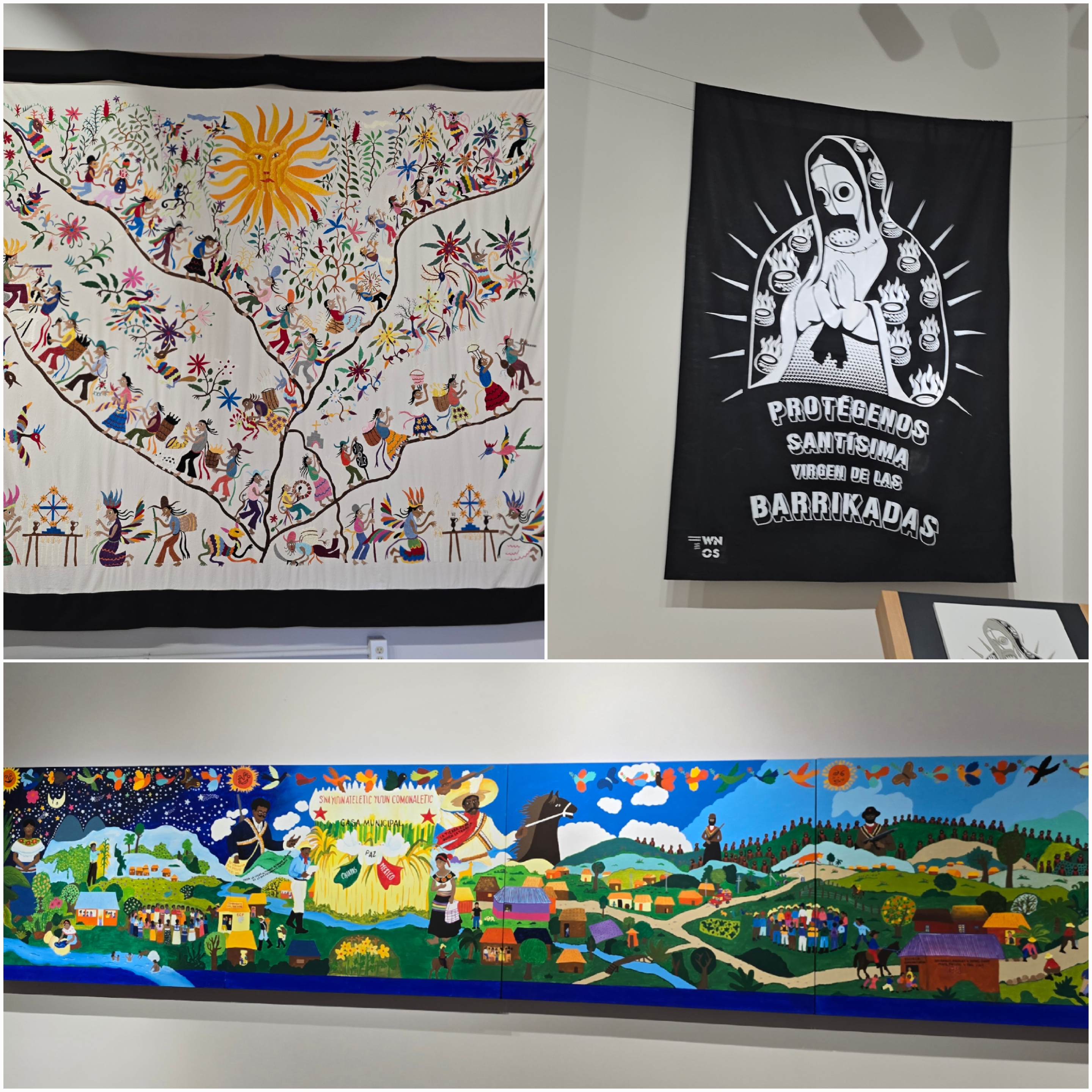 We stumbled into a side room—unmarked, or at least unannounced. The murals inside hit us before we even fully stepped in. One wall held a screenprint showing the Virgin Mary in a gas mask, the “virgin of the barricades.” Another depicted land and people as one continuous form—stitched, imperfect, alive. A third wasn’t painted at all but a quilt, sewn like a map. There was no finished product, polish, or attempt to perform mastery—just creation, raw and alive.