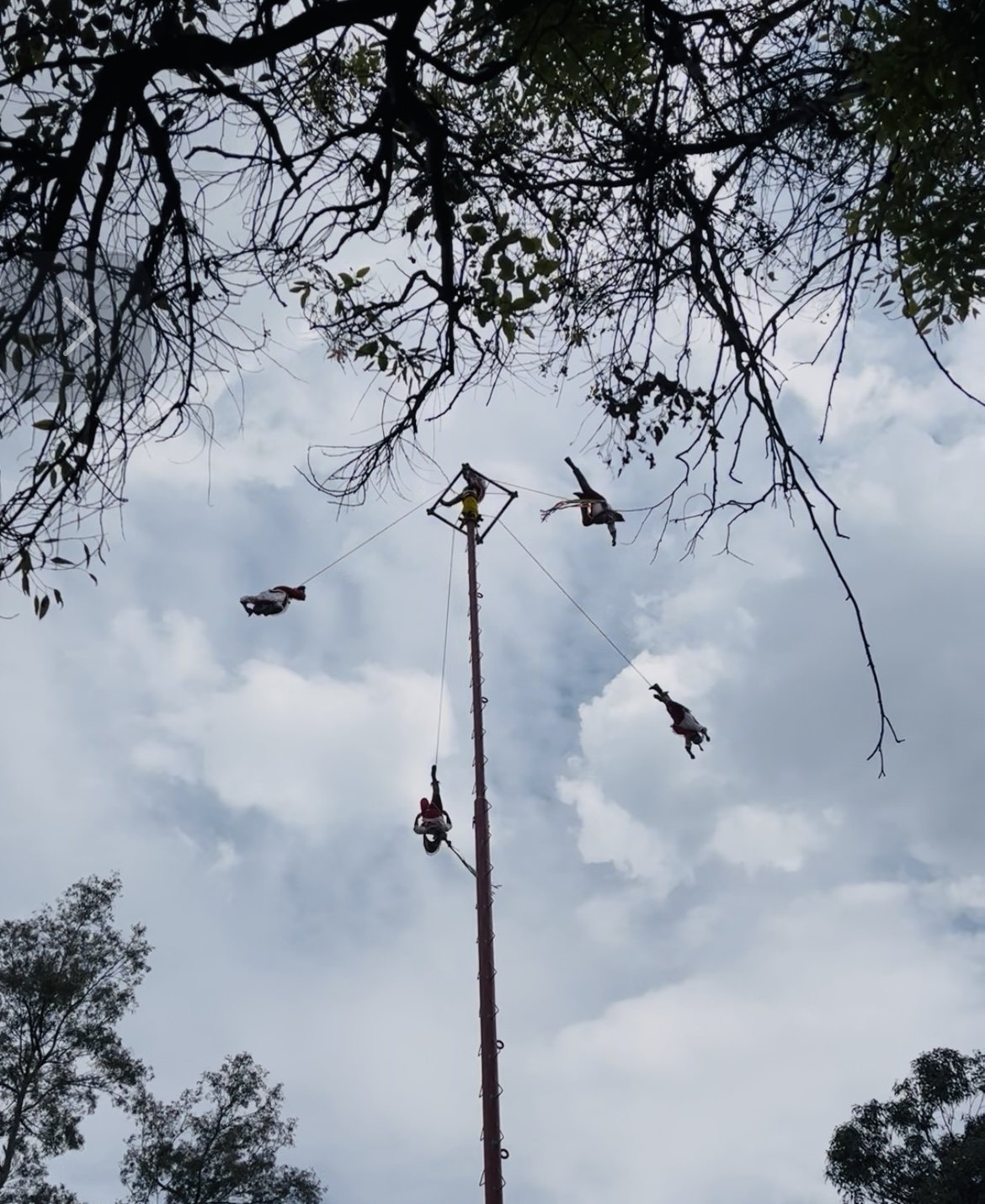 Watching Los Voladores de Papantla (flying men of Papantla) outside the Museo Nacional de Antropología presents an overwhelming embrace of life and death through deeply rooted tradition while confronting the fine line between life and death. The ceremony is performed by several ethnic groups in Mexico and Central America, especially the Totonac people in the eastern state of Veracruz. According to UNESCO, the ritual expresses respect for and harmony with the natural and spiritual worlds. Five performers climb a ninety-eight-foot pole, incorporating dance and music through flute and drums—a performance on a semi-permanent structure. Traditionally, the performers cut a tree “with forgiveness of the mountain god” (para 1, Tahin), reiterating this spiritual significance of the endeavor. Four men climb the pole as the fifth man plays the flute and the drums and ascends to the top of the pole. Four men representing the four winds or cardinal directions secure a foot to a rope while that music plays. Then, they are fastened to a twisted rope at the top of the pole to enable them to spin, and they dive into the void with sublimity. Slowly spinning down towards the Earth, “bringing to life the myth of the birth of the universe” (para1, Tahin), the men appear to enter into a trance-like state connecting them to the cosmos and themselves in a deeply rooted and entangled way. The overwhelming connection to the universe and the life/death cycle is palpable. The cultural and community values mimic a compost theory connecting the present's richness with the cosmos, representing what life is born from, rather than discarded and forgotten.