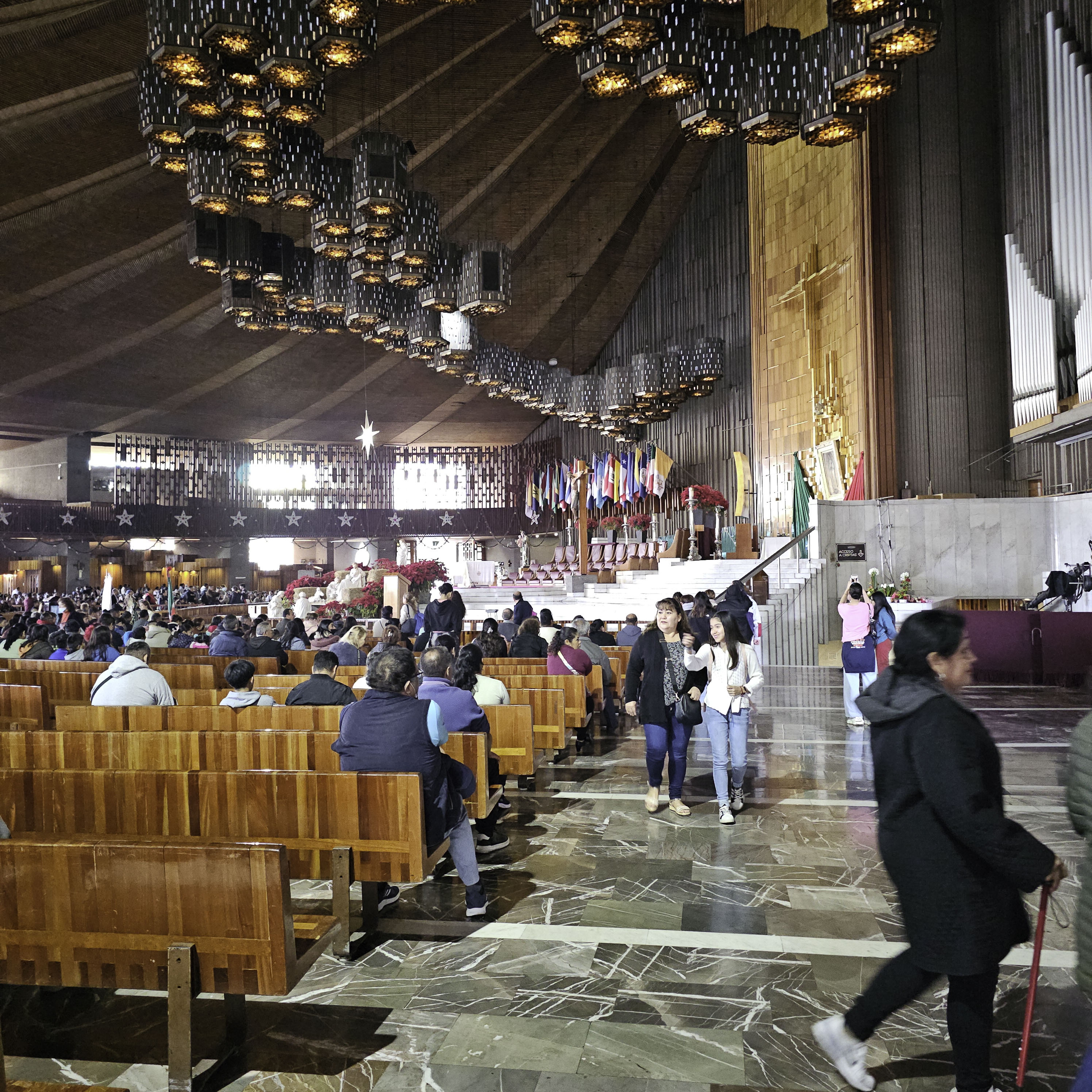 From this ancient economic, political, and spiritual center, one is swept forward in time but not, perhaps, out of mystery. The final day of the residency was a free day, and a visit to the Basilica of Our Lady of Guadalupe to see Juan Diego’s tilma was decided upon. The Basilica is a significant pilgrimage site, attracting approximately 20 million visitors yearly (Campos). According to Catholic tradition, the image of Mary had miraculously formed on Juan Diego’s cloak (Schmal). Juan was from the nomadic Chichimec people, who inhabited the area near Mexico City long before the Aztecs arrived (Schmal). While attending the Mass, I looked around at the more than one thousand seated attendees engaged in a newer form of religious sacrifice. Visiting these sites was an encounter with a 2000-year nexus, providing a testament to the enduring dialogue between Mesoamerican and Spanish worlds. The Basilica of Our Lady of Guadalupe, located at the foot of Tepeyac Hill, houses the tilma of Juan Diego, upon which the Blessed Virgin is said to have miraculously appeared in 1531. Unlike Teotihuacan, where anonymity and collective construction prevail, the tilma centers on an individual vision, its inexplicable material permanence, and spiritual resonance with believers, yet its image has become equally constitutive of a nation’s spiritual identity. The Virgin's mestiza features, the constellation of stars on her robe, and the desert flora beneath her all draw upon indigenous iconography while simultaneously establishing a Catholic narrative. The tilma functions as a syncretic relic, bridging the spiritual traditions of pre-Hispanic and colonial Mexico.